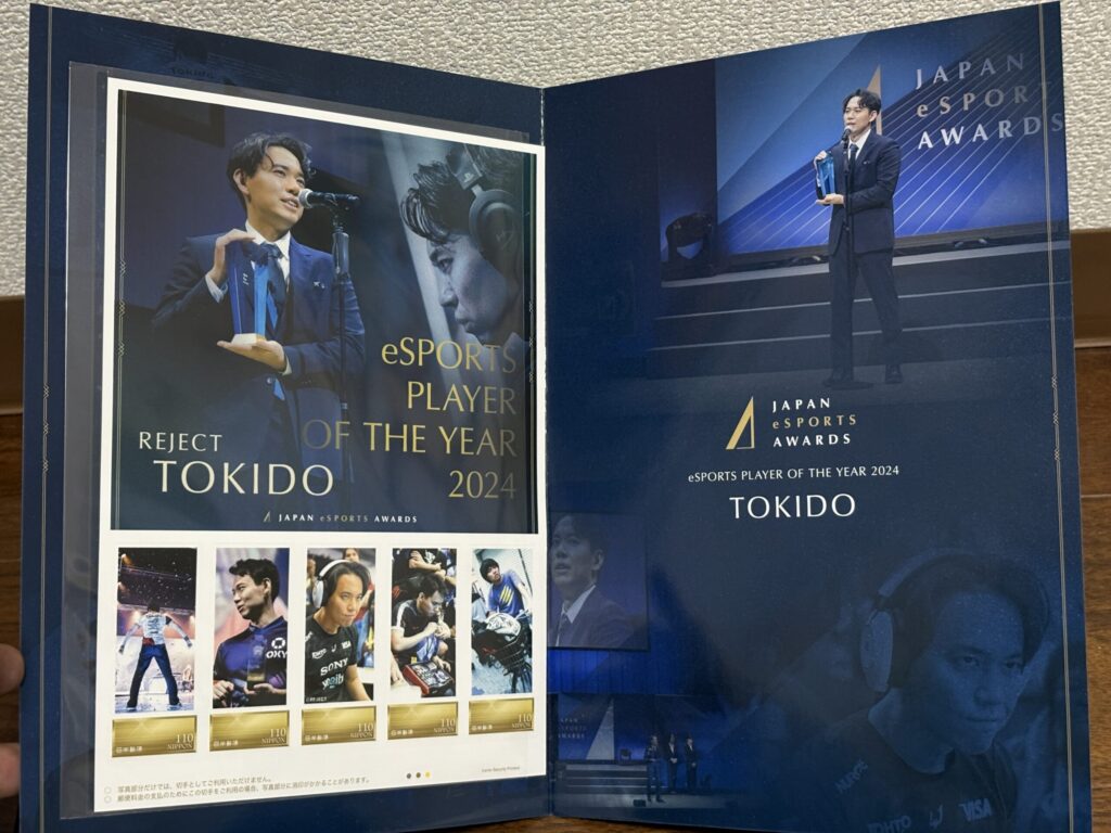 袋を開けると、台紙にデザインされた切手が5枚。ときど選手が前面に配置され、「eSports Player of the Year」を受賞した記念品であることが伝わってきます。